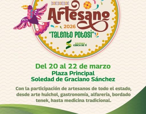 Del 20 al 22 de marzo, Soledad de Graciano Sánchez será sede del Festival Artesano Potosino 2026 “Talento Potosí”, un encuentro estatal que reunirá a creadoras y creadores de las cuatro regiones para celebrar nuestra identidad, tradición y orgullo potosino.