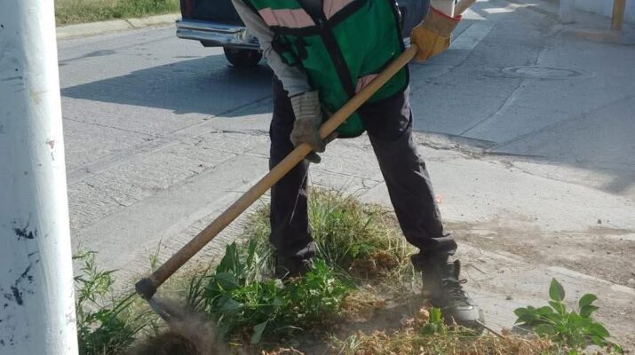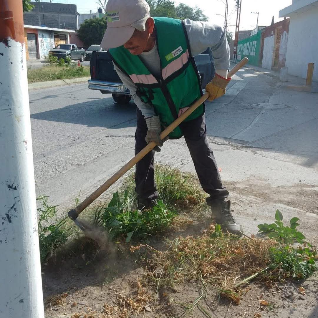 Equipo de Imagen Urbana continúa con trabajos de limpieza en la Av. María Teresa, colonia La Lomita, atendiendo camellón central y laterales con barrido, deshierbe y recolección de desechos, ramas, maleza y tierra.